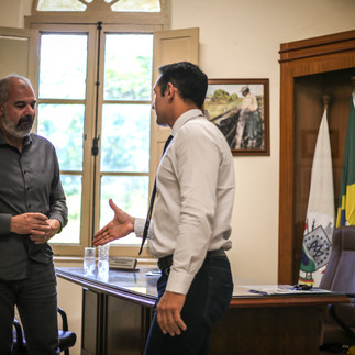 O prefeito de Santa Maria em exercício, Rodrigo Décimo, foi até a Câmara de Vereadores de Santa Maria na manhã desta sexta-feira (6) para fazer uma visita cortesia para o novo presidente da Câmara, o vereador Givago Ribeiro e também discutir assuntos sobre inovação, tecnologia e o desenvolvimento de Santa Maria. A reunião começou por volta das onze horas e se estendeu por cerca de quarenta minutos.